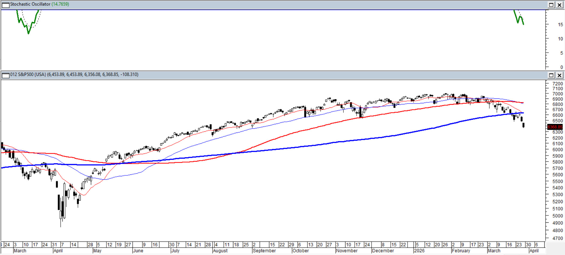 Pokłosiem piątkowej sesji był kolejny spadek amerykańskiej „pięćsetki”, otwarcie okna bessy i najniższe zamknięcie od sierpnia. Kurs znalazł się w tym tygodniu już poniżej średniej z 200 sesji, co istotnie komplikuje sytuację byków. Trend spadkowy prowadzi klasycznie średnia z 15 sesji. Oscylatory wolne i szybkie weszły żwawo w strefę wyprzedania – są najniżej od roku, co zapewne sprawi, że nadchodzący tydzień przyniesie próbę poprawy sytuacji po stronie popytu. Wykres tygodniowy przynosi piąty kolejny czarny korpus, piąty raz w ciągu ostatnich 20 lat.