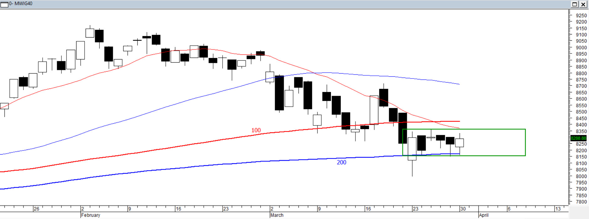 Ostatni raz na koniec sesji pod średnią z 200 sesji indeks przebywał w 2024 w grudniu. Teraz znów znalazł się w tym rejonie i od pięciu sesji konsoliduje w wąskim prostokącie tuż przy tej granicy. To nadal zbyt mało, by przestraszyć niedźwiedzie — zwłaszcza że krótsza średnia z 15 sesji opada i za chwilę wejdzie w strefę tej konsolidacji, tworząc nad rynkiem dodatkowy ruchomy opór. Byki walczą, ale pole manewru mocno się zwęża.
