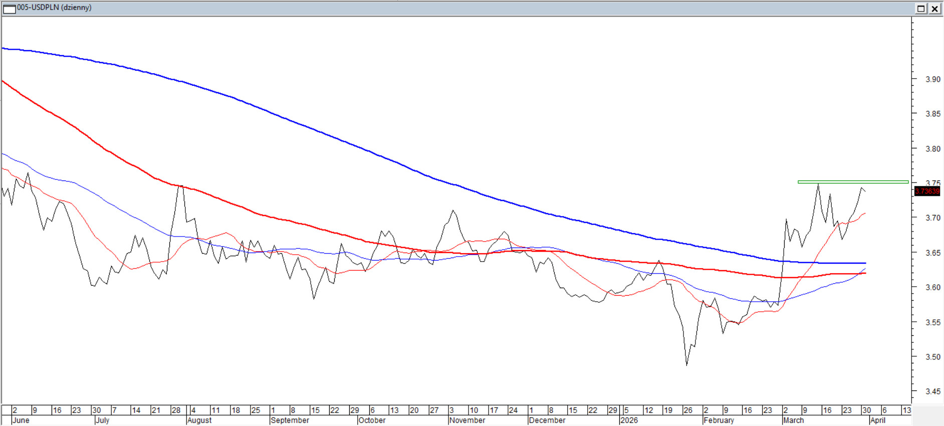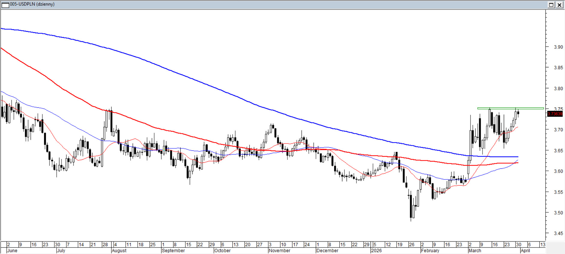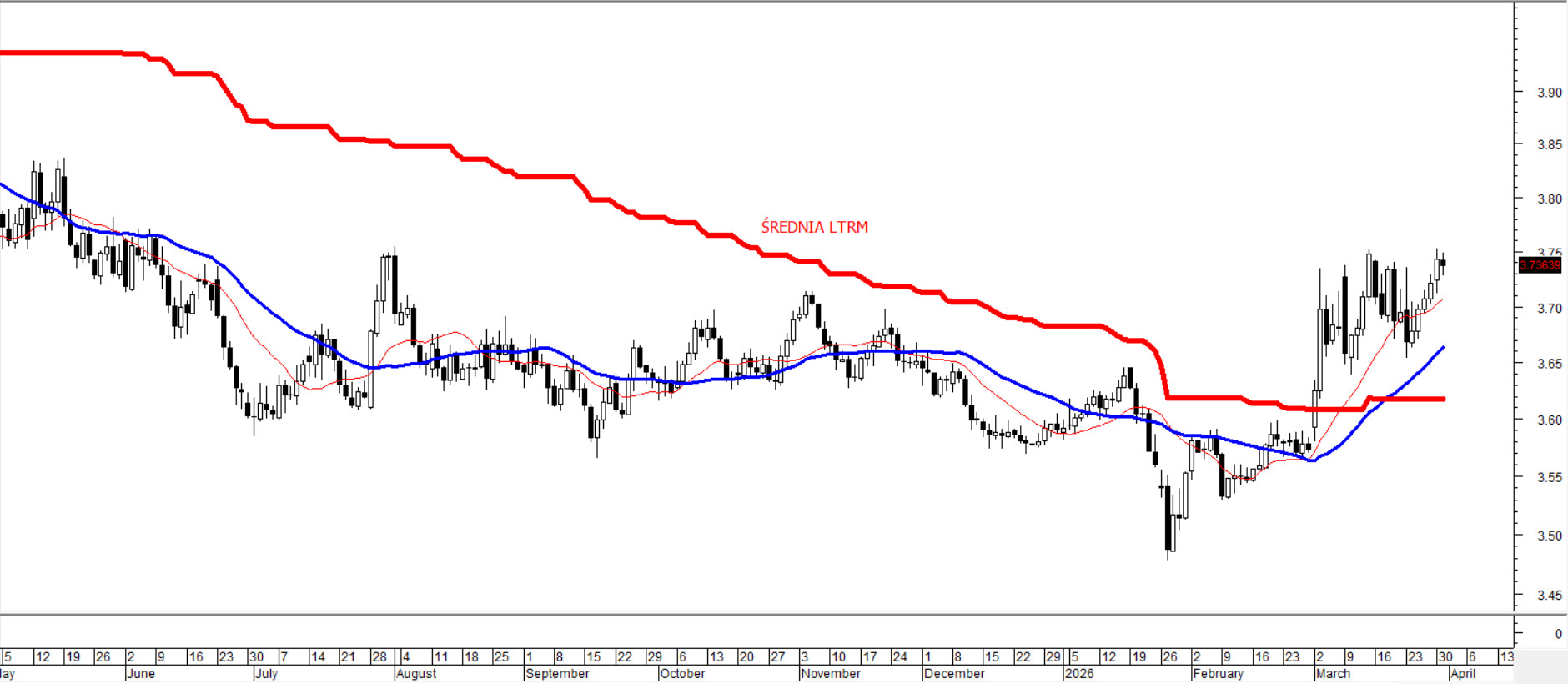 Bonów w Polsce dawno już nie ma, Marek ani cinkciarzy także, ale są Dolary — i w ostatnim okresie czują się znakomicie. Kurs po przebiciu średnich 15/45/100/200 nie zwalnia i już w marcu penetrował wakacyjne maksima. Średnie 15/45 sesji ułożone są w sposób typowy dla świeżo zainicjowanego trendu wzrostowego i prowadzą ruch od dołu, nie dając złotemu zbyt wielu chwil na umocnienie. ADX(14) rośnie, potwierdzając utrendowienie po stronie dolara. Z perspektywy elliottowskich fal można dostrzec próbę uformowania klasycznej piątki — co oznacza, że para znajduje się w impulsie.