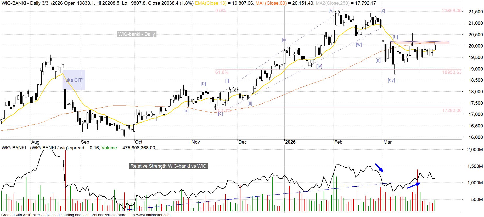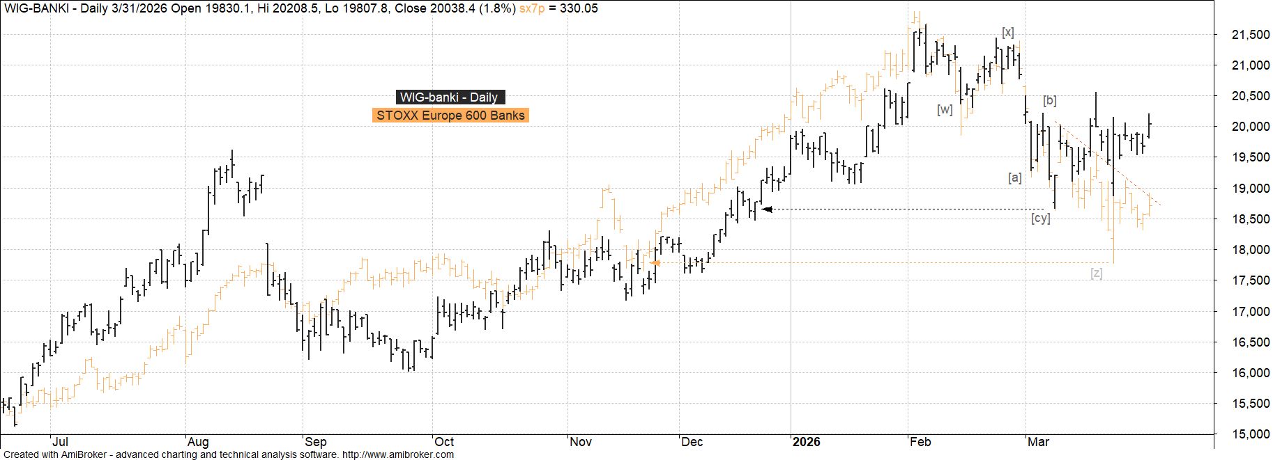 Trwająca od początku lutego spadkowa korekta sektorowego indeksu WIG-banki wraz z nienaruszonym do tej pory minimum z 9 marca pozostaje w formie podwójnego zygzaka [w][x][y] celującego w rejon typowego 61.8-procentowego zniesienia Fibo wcześniejszego 5-falowego impulsu wzrostowego. Zważywszy na tendencję do kończenia się fal łącznikowych w rejonie szczytów fal [b], jednym z lepszych sygnałów zamknięcia korekty i przejścia do ruchu wzrostowego byłoby w tym przypadku przekroczenie niedalekiego pułapu 20 217 pkt (już raz nieudanie testowany szczyt fali [by]). Nadal natomiast problematyczną kwestią jest wsparcie ze strony europejskiego sektora bankowego reprezentowanego przez STOXX Europe 600 Banks (krajowe składowe to PKO BP i Pekao). Zniesienie poprzedniej fali wzrostowej wyniosło w tym przypadku 100%, a funkcję ruchomego oporu nadal z powodzeniem pełni opadająca średnia EMA(13).