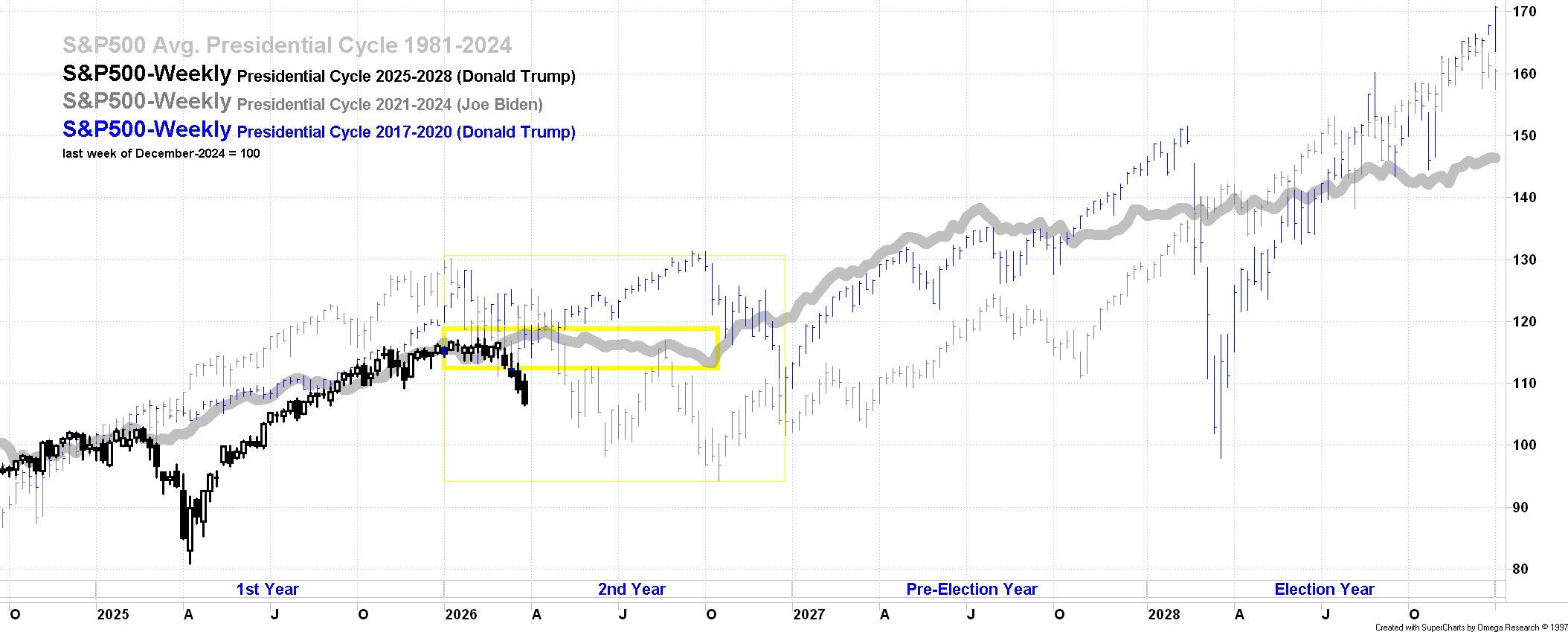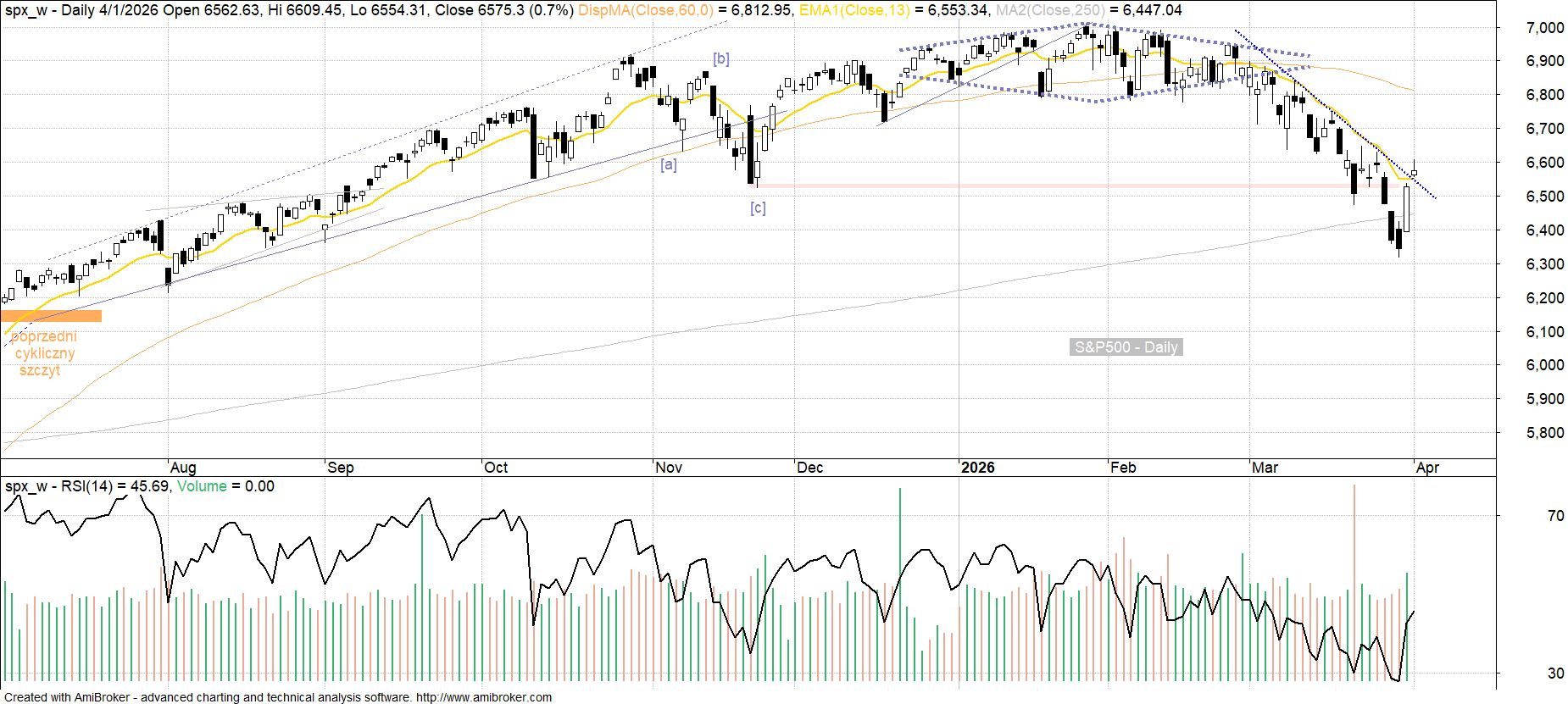 Po negatywnym rozwiązaniu szczytowej formacji diamentu z pierwszych dwóch miesięcy roku, marzec przyniósł spadek S&P500 poniżej istotnego poziomu 6 521 pkt z 21 listopada ub.r. (dno ostatniej globalnej korekty niższego rzędu), co generalnie na pozostałych rynkach bazowych nie miało miejsca. W średnim terminie zza Oceanu płynie więc na razie odosobnione wskazanie przemawiające za wejściem w poważniejszy ruch korygujący. Byłoby ono zresztą zgodne z historycznym wzorcem 4-letniego cyklu prezydenckiego, w którym słabe zachowanie amerykańskiego rynku akcji jest zdecydowanym wyróżnikiem pierwszych trzech kwartałów trwającego właśnie roku drugiego. Na krótką metę natomiast w bieżącym tygodniu pojawiły się wskazania przemawiające za odreagowaniem w górę, do których można zaliczyć zarówno najniższe od czasu cyklicznego dna z kwietnia ub.r. odczyty RSI, jak i wystarczająco schłodzony sentyment. Nawet z punktu widzenia wspominanego cyklu prezydenckiego odchylenie w dół od sezonowego wzorca jest na tyle duże, że mogłoby stać się powodem tymczasowej kontrakcji.