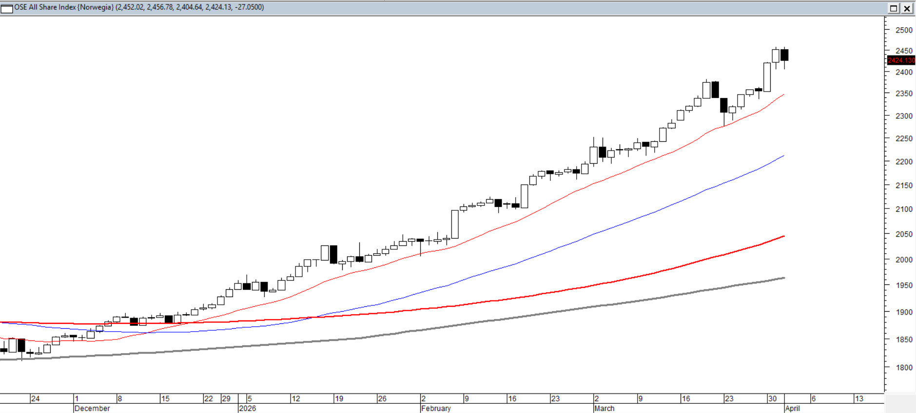 Od końca grudnia indeks urósł o blisko 25%. W ten sposób norweski rynek powinien bez trudu znaleźć się w ścisłej czołówce największych wzrostów indeksowych na świecie w tamtym kwartale. Szeroki indeks około 180 spółek notowanych na Oslo Børs rósł praktycznie bez przerwy, a średnia z 15 sesji prowadziła trend bez żadnych wątpliwości. Oscylatory są jednak wykupione do granic — i wręcz proszą o jakąkolwiek korektę. Byki cały kwartał grały w koszulkach reprezentacji Norwegii. Czas na oponentów — piłka po stronie niedźwiedzi.