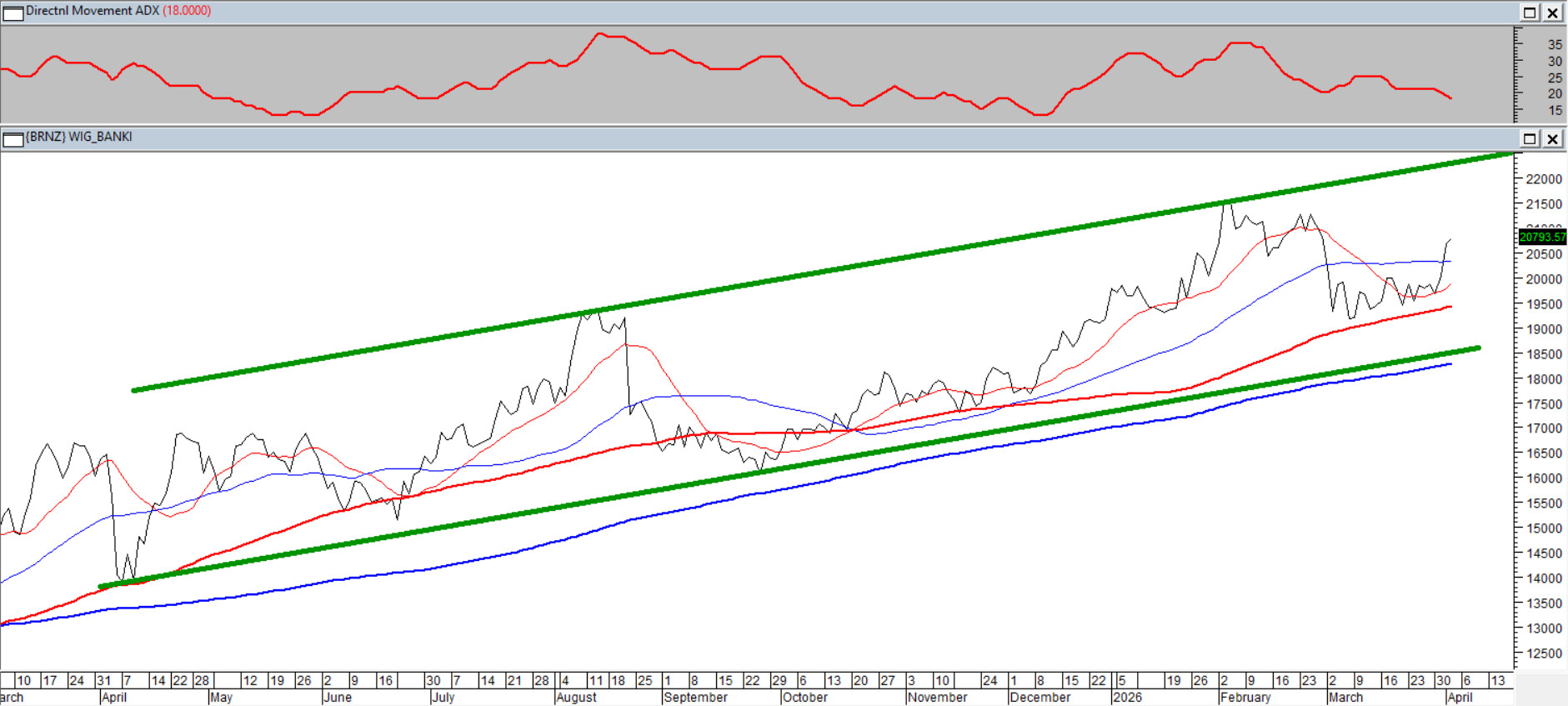 Po ostatniej przedświątecznej sesji kurs sektora bankowego znalazł się raptem 3,5% od rocznych maksimów z początku lutego. Byki dostały swoją szansę — kurs wrócił ponad sekwencję średnich 15/45, a chroniąca je „setka" od jesieni porusza się leniwie w górę. Od roku kurs porusza się w szerokim kanale wzrostowym. ADX(14), opadając, nadal szuka trendu.