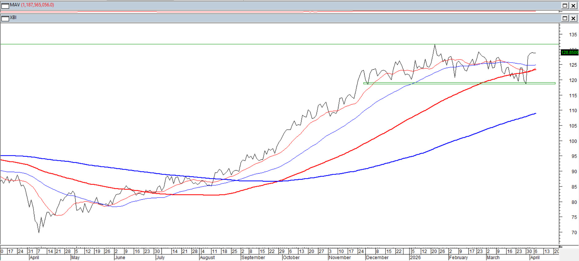 XBI to jeden z najpopularniejszych ETF-ów śledzących sektor biotechnologiczny na amerykańskim rynku — koszyk kilkudziesięciu spółek biotech notowanych na NYSE i Nasdaq, z dziennym obrotem przekraczającym miliard dolarów. W odróżnieniu od konkurencji każda spółka ma tu równy udział — małe i średnie firmy biotech ważą tyle samo co największe, co sprawia, że wyniki badań klinicznych potrafią poruszyć całym indeksem. Trend wzrostowy jest tu bezsprzeczny — kurs porusza się ponad rosnącą sekwencją średnich od jesieni ubiegłego roku. Minima korekty listopadowej zostały zachowane, a marcowe dołki przetestowane i obronione. W szerszym ujęciu popyt mierzy się teraz z długoterminową sekwencją szczytów z 2021 roku.