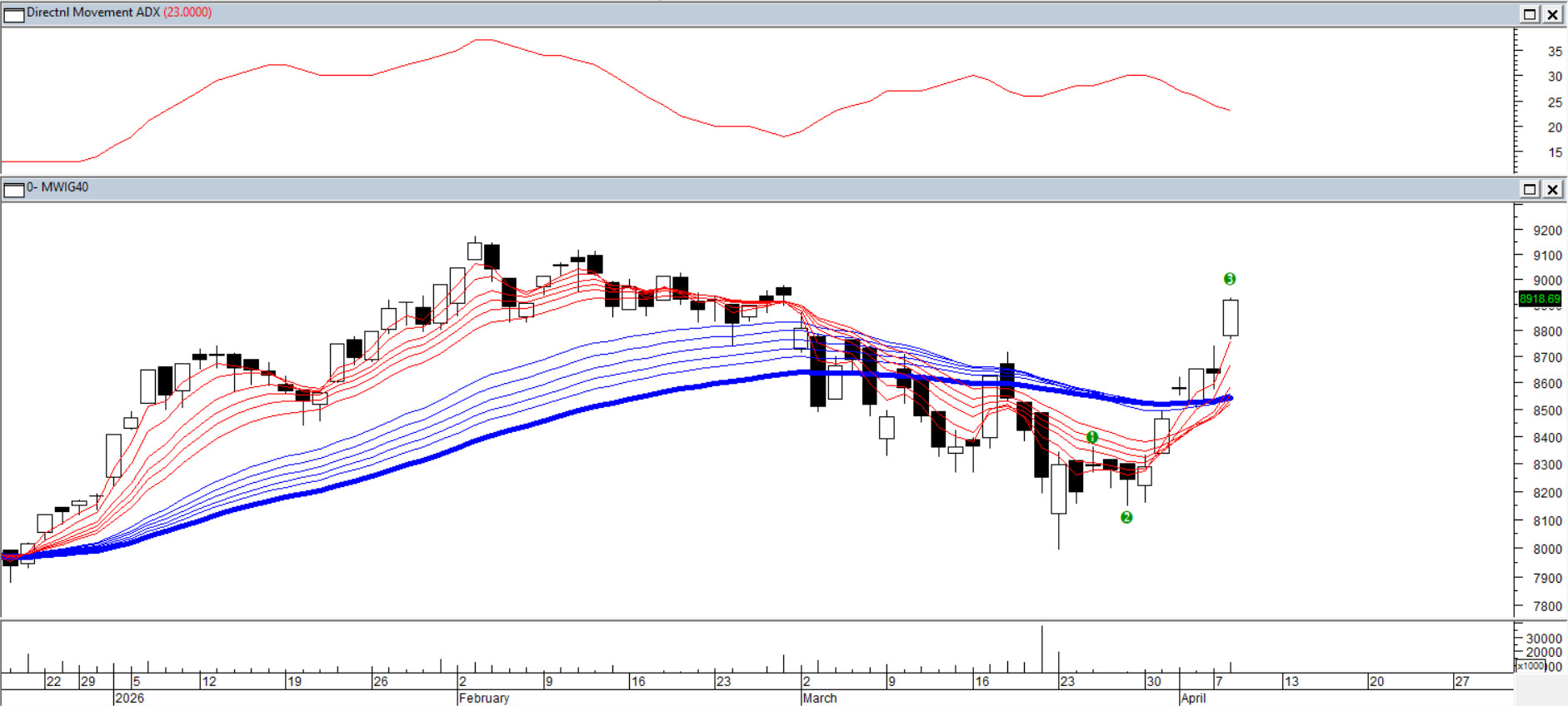 Nocne wydarzenia stały się katalizatorem silnego ruchu w górę także w segmencie średnich spółek. W efekcie kurs utworzył okno hossy 8741–8764 pkt, zamykając jednocześnie "wojenne" okno bessy z początku marca. Średnie Guppy'ego dały sygnał powrotu na rynek jeszcze przed świętami, a dodatkowe wydłużenie sugeruje, że kurs znajduje się już w elliottowskiej fali III licząc od marcowego dołka. Ciekawym elementem układanki pozostaje ADX(14), który opadając, wciąż szuka trendu.