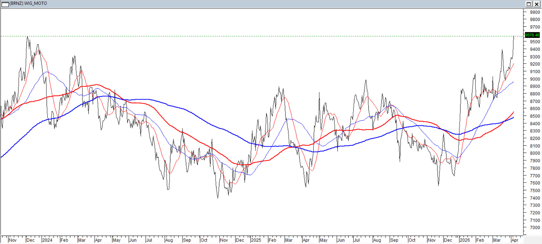 Podczas ostatnich sesji indeks zaatakował z sukcesem historyczne ekstrema z końca 2023 roku, otwierając sobie drzwi na wyższe poziomy. Układ średnich 15/45/100/200 jest pozytywny — typowy dla spokojnego trendu wzrostowego. Warte uwagi jest to, że indeks wykazuje zwiększoną siłę relatywną — "wojenny" marzec był dla niego wzrostowy, a wynik +5% mówi sam za siebie. Oscylatory zarówno szybkie, jak i wolne nie znalazły się jeszcze w strefie silnego wykupienia, co oznacza, że potencjał do kontynuacji z pewnością istnieje.