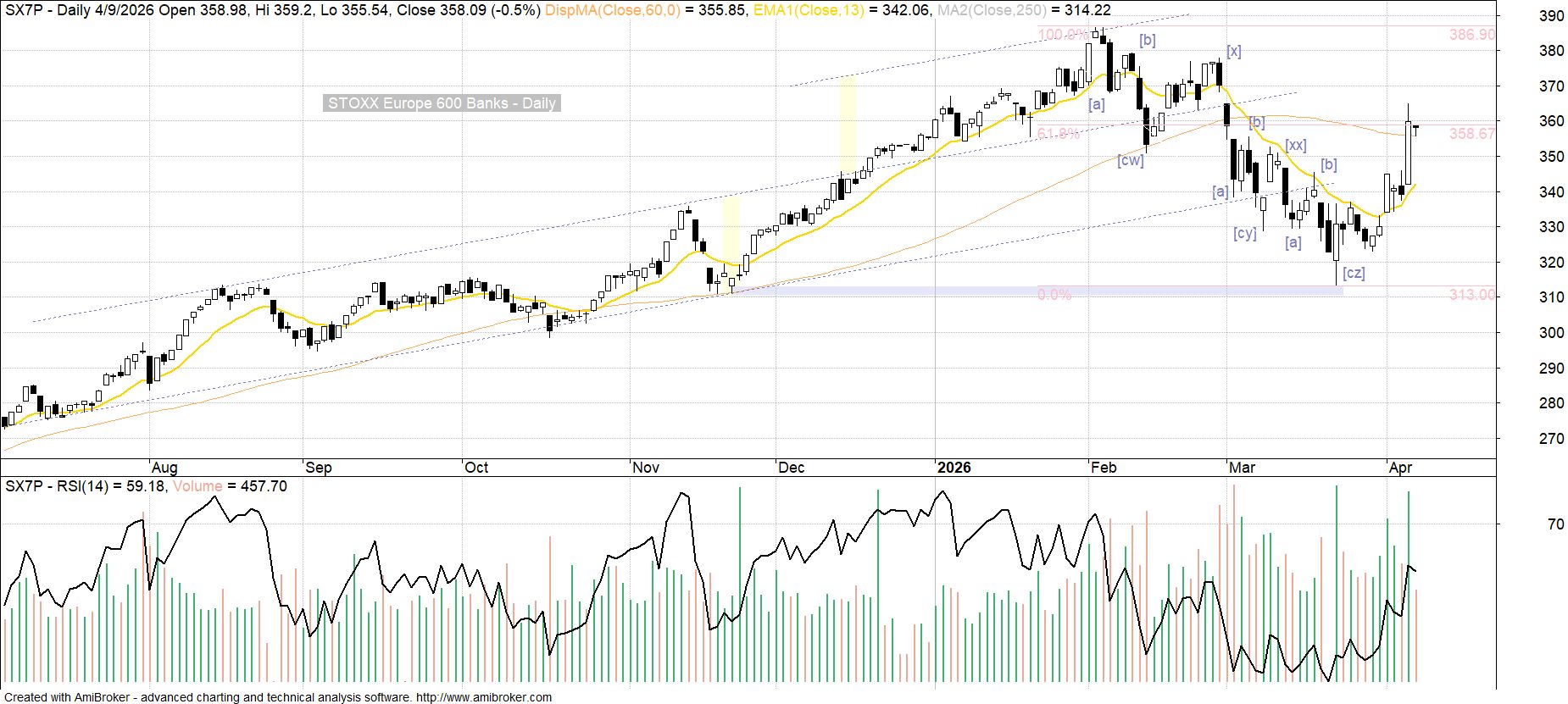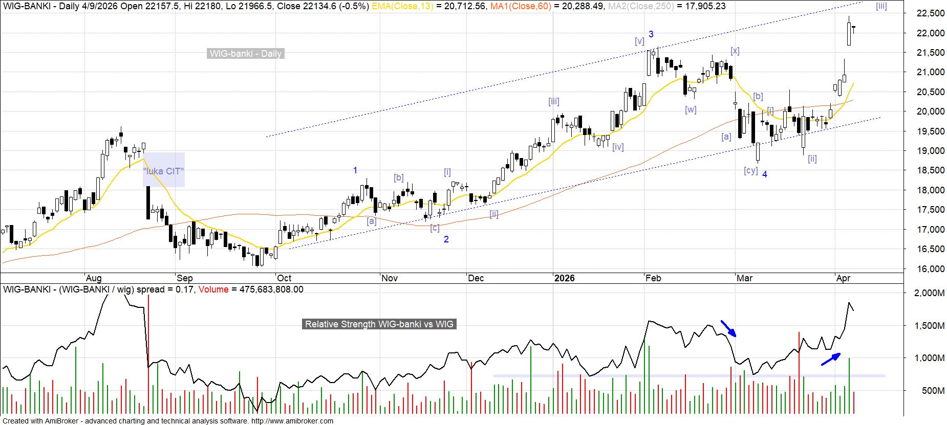 Środowa entuzjastyczna reakcja na zapowiedzi rozmów pokojowych na Bliskim Wschodzie dla indeksu WIG-banki oznaczała dynamiczne wyjście na nowe rekordy hossy. Tymczasem w przypadku europejskiego sektora bankowego reprezentowanego przez STOXX Europe 600 Banks (krajowe składowe to PKO BP i Pekao) odbywała się ona jeszcze w ramach próby zwrotu po lutowo-marcowym cofnięciu. Choć ostatecznie można tu mówić o sygnałach wzmocnienia pozwalających na lekką preferencję scenariusza testu lutowych maksimów, to tak znacząco wyprzedzający charakter zmian na rodzimym rynku wypada uznać za dodatkowy czynnik niepewności. Reguła kanałowania dla kilkumiesięcznej perspektywy sugeruje dla indeksu WIG-banki możliwość przedłużenia obecnej zwyżki do rejonu 23.0 tys. pkt, tym bardziej, że nosi ona wszelkie cechy fali [iii] w potencjalnym 5-falowym impulsie budowanym od czasu marcowego dołka.