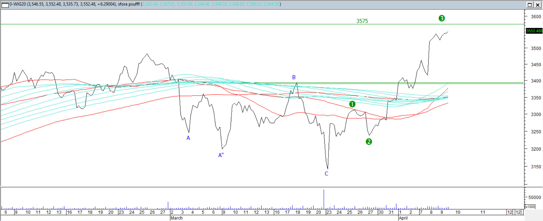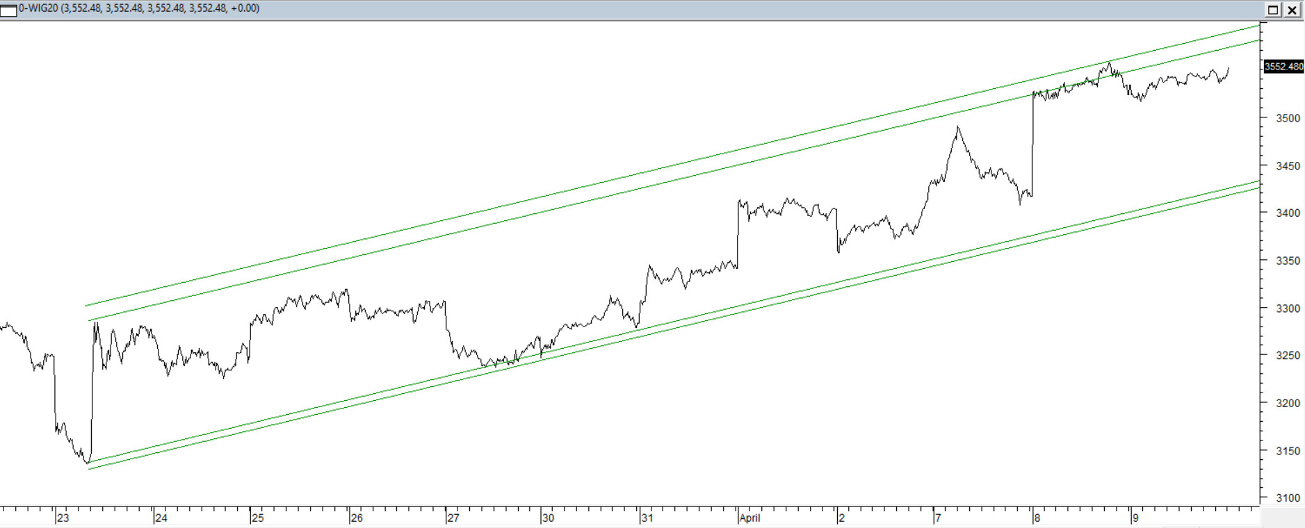 Po pokonaniu maksimum z połowy marca kurs wszedł w realizację planu "impuls", znajdując się tym samym w elliottowskiej fali III. Minimalny zasięg całego impulsu mierzony od dołka fali C wynosi 3575 pkt — jednak przy braku klasycznej korekty w fazie Profit Taking można założyć, że ekstremum wypadnie wyżej. Średnie 50/100/200 ułożone są klasycznie dla trendu wzrostowego w tej perspektywie czasowej. A relatywnie wysoko umiejscowiony ADX(14) będzie sprzyjał szybkiemu szturmowaniu szczytu tej fali i przejściu do klasycznej korekty. Natomiast na wykresie 5-cio minutowym można dostrzec zgrabnie wpisany w kurs 2-tygodniowy kanał wzrostowy.