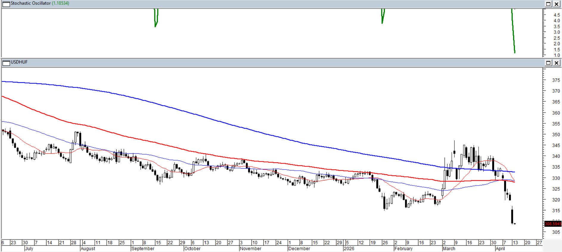 Jeszcze przed niedzielnym wyborami do węgierskiego parlamentu Forint emanował siłą — i to nie tylko w stosunku do dolara. Wyniki wyborów dopełniły obrazu całości, a uformowane w poniedziałek okno hossy i ukształtowany tego dnia korpus dają forintowi kolejne bycze argumenty. Kurs znalazł się najniżej od początku 2022 roku. Średnie 15/45/100/200 wskazują na trend spadkowy dolara w stosunku do forinta. Łyżką dziegciu jest wyjątkowo niski poziom oscylatorów szybkich, które mogą sygnalizować chwilowe wyczerpywanie potencjału — niemniej nie ma wątpliwości kto tu rządzi.