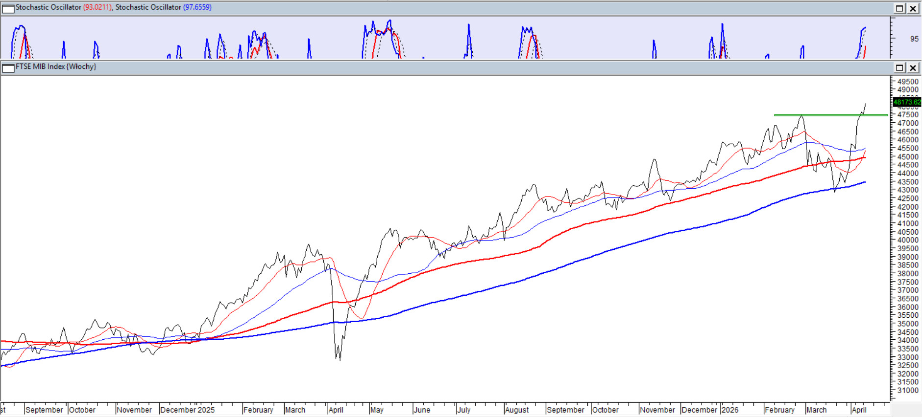 Indeks mediolańskiej giełdy uporał się ze spadkami, jakie miały miejsce wiosną — w dużej mierze wynikającymi z problemów w Zatoce Perskiej — i w ciągu ostatnich dni uformowały się tu nowe wieloletnie maksima. Co ciekawe, nie są to historyczne rekordy, bo te zostały ustanowione jeszcze podczas hossy internetowej w 2000 roku. Rekordowe 50 100 pkt oznacza, że bykom brakuje jeszcze około 4% — a wydarzenia ostatnich dni upewniają uczestników rynku w przekonaniu, że wszystko zmierza w tamtym, a zatem właściwym kierunku. Warto jednak zwrócić uwagę na dość szybkie oscylatory. Te znajdują się ponownie na dość wysokich poziomach i mogą podjąć próbę powstrzymania rajdu fanów kolejnych rekordów.
