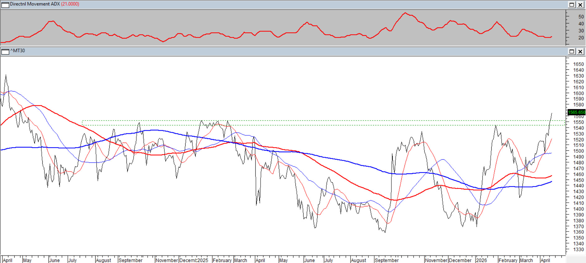 MT30 to indeks trzydziestu największych spółek notowanych na saudyjskiej giełdzie Tadawul — sercu arabskiego rynku kapitałowego. Kłopoty marcowe w Zatoce Perskiej tylko opóźniły pochód byków w kierunku nowych wieloletnich ekstremów. Ten tydzień przynosi nowe dwuletnie maksima i dynamiczne sforsowanie zimowych oporów. Średnie 15/45/100/200 ułożone są stosunkowo szeroko, co sprawia wrażenie że trend nie był wcześniej wyraźnie "przygotowany". Marzenie byków — wykonać zasięg o wysokości półtorarocznej konsolidacji, czyli 1750 pkt. Co może być dość trudne, ale przecież nikomu się nie śpieszy. Na pustyni czas płynie inaczej.