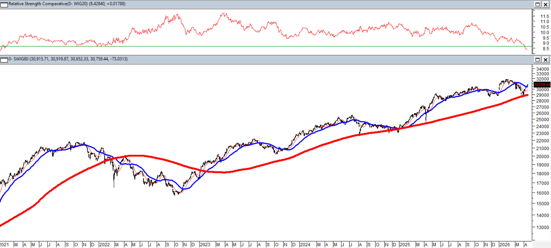 Uspokajając czytelników — nie chodzi tu o wartość indeksu małych spółek, lecz o siłę relatywną sWIG80 względem indeksu WIG20, która spadła do najniższego poziomu od pięciu lat. Małe spółki tracą na tle blue chipów już od dłuższego czasu, a w sposób dynamiczny od ubiegłorocznej jesieni — i to jest właśnie to, co powinno przykuć uwagę inwestorów. Długoterminowa średnia 300-sesyjna wciąż wspiera trend wzrostowy, ale zbliżające się do niej notowania każą wzmóc czujność. Na pewno dobrze to nie wygląda.
