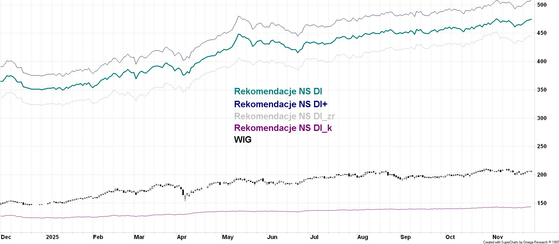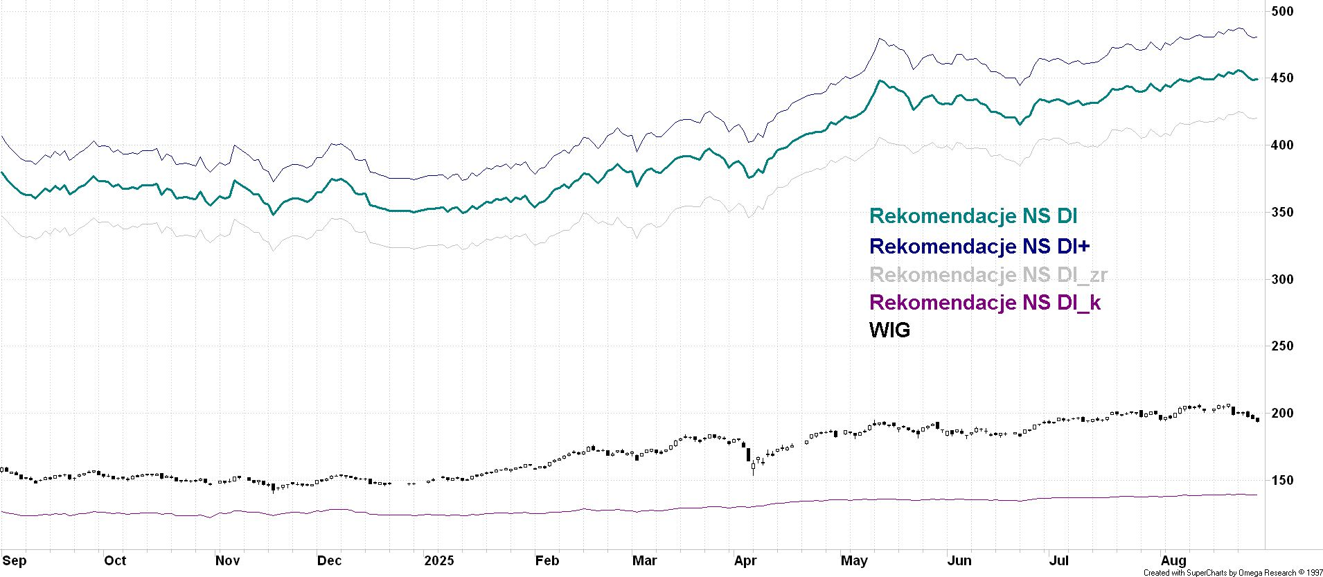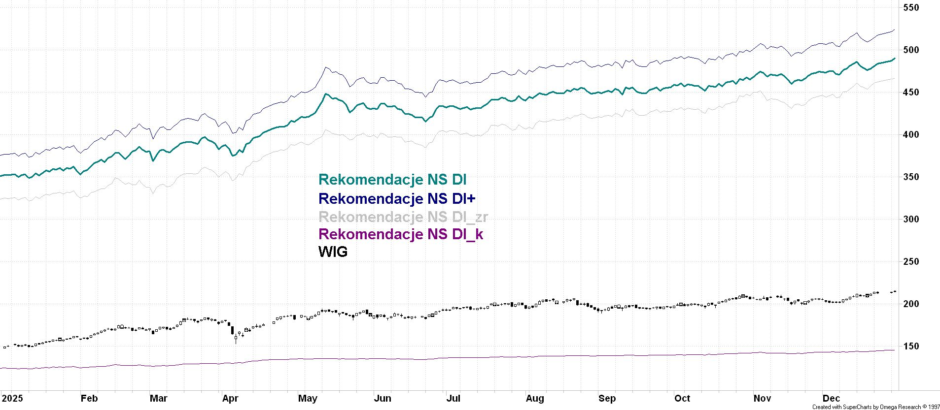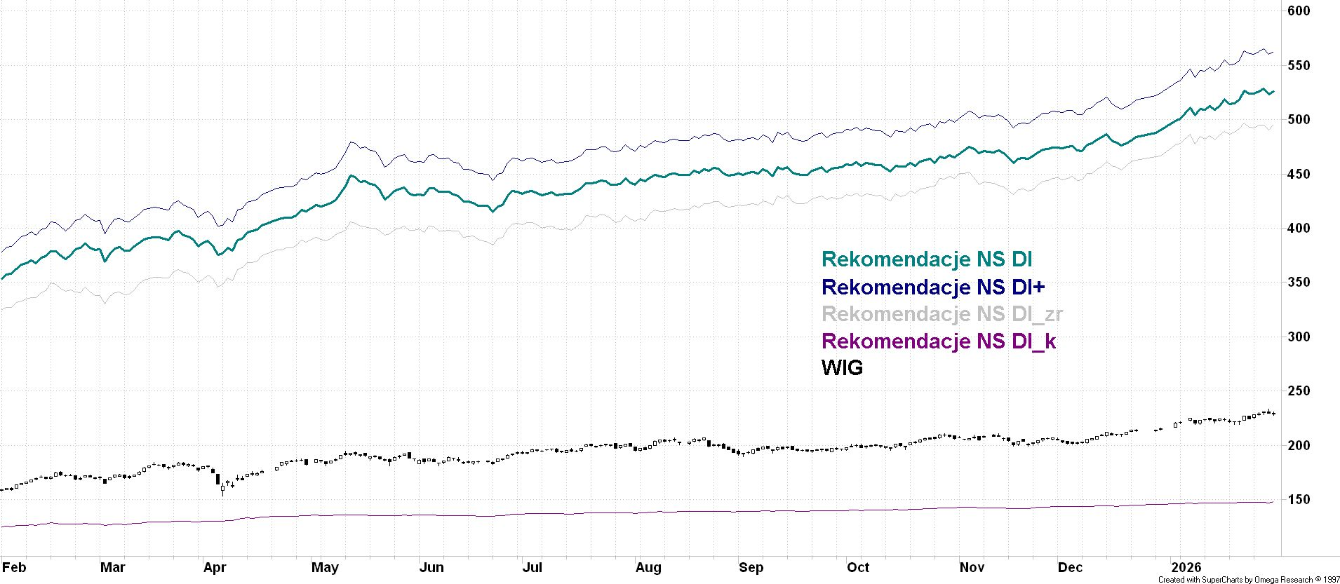 Wykres indeksu Rekomendacje NS DI obrazuje wynik brutto części akcyjnej portfela w ramach strategii agresywnej (dopuszcza się udział akcji do 90% wartości portfela, przy czym w celu poprawy płynności portfela zaleca się posiadanie ok. 10% środków w gotówce lub w obligacjach szybko zbywalnych), przy założeniu realizacji wszystkich rekomendacji z maksymalnym zaangażowaniem kapitału w pojedynczą spółkę wynoszącym 10%.