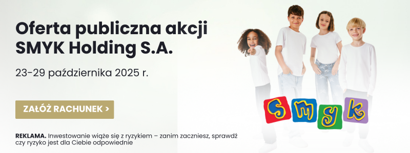 Niniejszy materiał: (i) nie jest przeznaczony do rozpowszechniania na terytorium albo do Stanów Zjednoczonych Ameryki, ani w żadnych innych państwach, gdzie może to podlegać ograniczeniom/być zakazane przez prawo oraz (ii) ma charakter reklamy i nie stanowi oferty sprzedaży lub subskrypcji ani zaproszenia do nabycia akcji SMYK Holding S.A. („Spółka”). Prospekt sporządzony w związku z ofertą publiczną akcji Spółki w Polsce oraz ich dopuszczeniem i wprowadzeniem do obrotu na rynku regulowanym został zatwierdzony przez Komisję Nadzoru Finansowego w dniu 22 października 2025 r. i jest dostępny na stronie internetowej Spółki (smykgroup.com/oferta-publiczna). Zatwierdzenia prospektu przez KNF nie należy rozumieć jako poparcia dla akcji Spółki będących przedmiotem oferty publicznej oraz dopuszczenia do obrotu na rynku regulowanym.