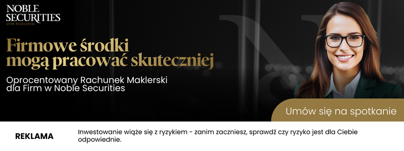 Materiał stanowi informację handlową i jest upowszechniany wyłącznie w celu reklamy lub promocji usług Noble Securities S.A. z siedzibą w Warszawie (00-838) przy ul. Prostej 67, www.noblesecurities.pl. Inwestowanie w instrumenty finansowe wiąże się z ryzykiem utraty całości lub części zainwestowanych środków. Informacje o ryzyku związanym z inwestowaniem w instrumenty finansowe zamieszczone są na stronie internetowej: www.noblesecurities.pl w zakładce Dom maklerski / Rachunek maklerski/ Dokumenty. Zasady korzystania z Rachunku maklerskiego znajdują się odpowiednio w Umowie o świadczenie usług maklerskich i brokerskich oraz Regulaminie świadczenia przez Noble Securities S.A. usług maklerskich oraz prowadzenia rachunków papierów wartościowych i rachunków pieniężnych, które dostępne są na: www.noblesecurities.pl. Inwestowanie w instrumenty finansowe wiąże się z ryzykiem utraty całości albo części zainwestowanych środków pieniężnych. Szczegółowe informacje o ryzyku związanym z inwestowaniem dostępne są na stronie internetowej www.noblesecurities.pl.